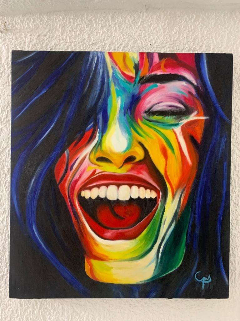 La obra representa a una mujer riéndose enérgicamente, rodeada de colores vibrantes y vivos que la envuelven en una atmósfera de alegría y felicidad. Supongo que la pintura se trata de una representación de la felicidad o la euforia, tal vez de un momento de liberación o de triunfo. Los detalles de la obra sugieren una expresividad y vitalidad increíbles, transmitiendo una sensación de optimismo y positividad que anima al espectador.
